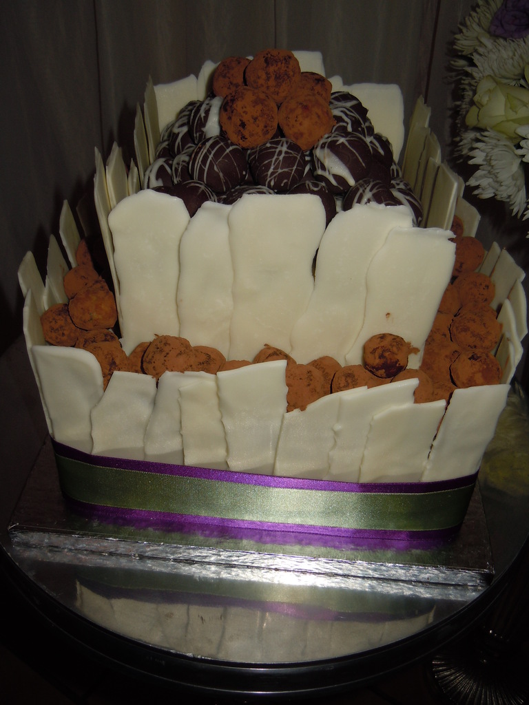 2 Tiered 3 Layer Wedding cake with Cream Cheese Icing covered in White Chocolate strips and filled with Milk and Dark Chocolate Truffles