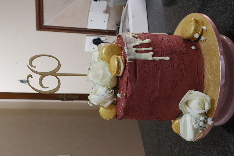 3 Layer Chocolate cake with Buttercream Icing, fresh roses and French Vanilla Macarons