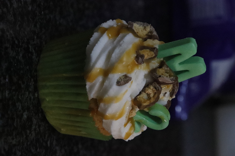 Vanilla Cupcake with Buttercream Icing decorated with crushed Whispers and Caramel drizzle